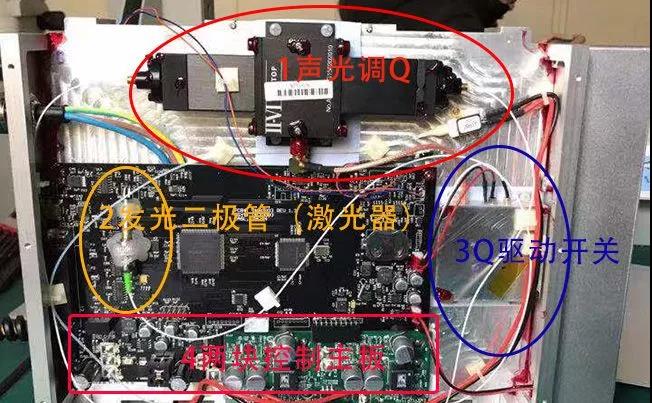 激光器的模块包含了发光二极管、声光调Q、Q开光、PCB电路板、风扇、散热模块、光纤、温度反馈控制测量模块、扩束模块、传输光纤等等,这里只是作为满足大家的好奇心,不做任何技术探讨。