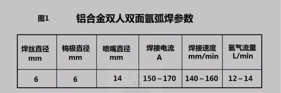 现有一厚度为12mm的铝合金(LF2)分馏塔设备要焊接,通过分析为了减小焊接过程中变形的产生以及其他缺陷的产生,现在采用双人双面氩弧焊接工艺,进行焊接,需要保证焊接的两人必须同步,能够减少焊接变形的产生。具体焊接参数见图1。